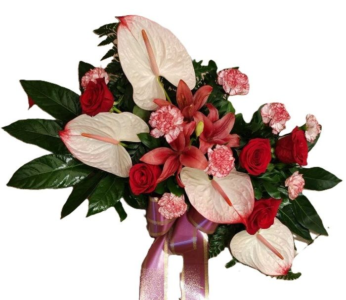 The arrangement consists of greenery and mixed flowers in the selected color (red, white, pink)