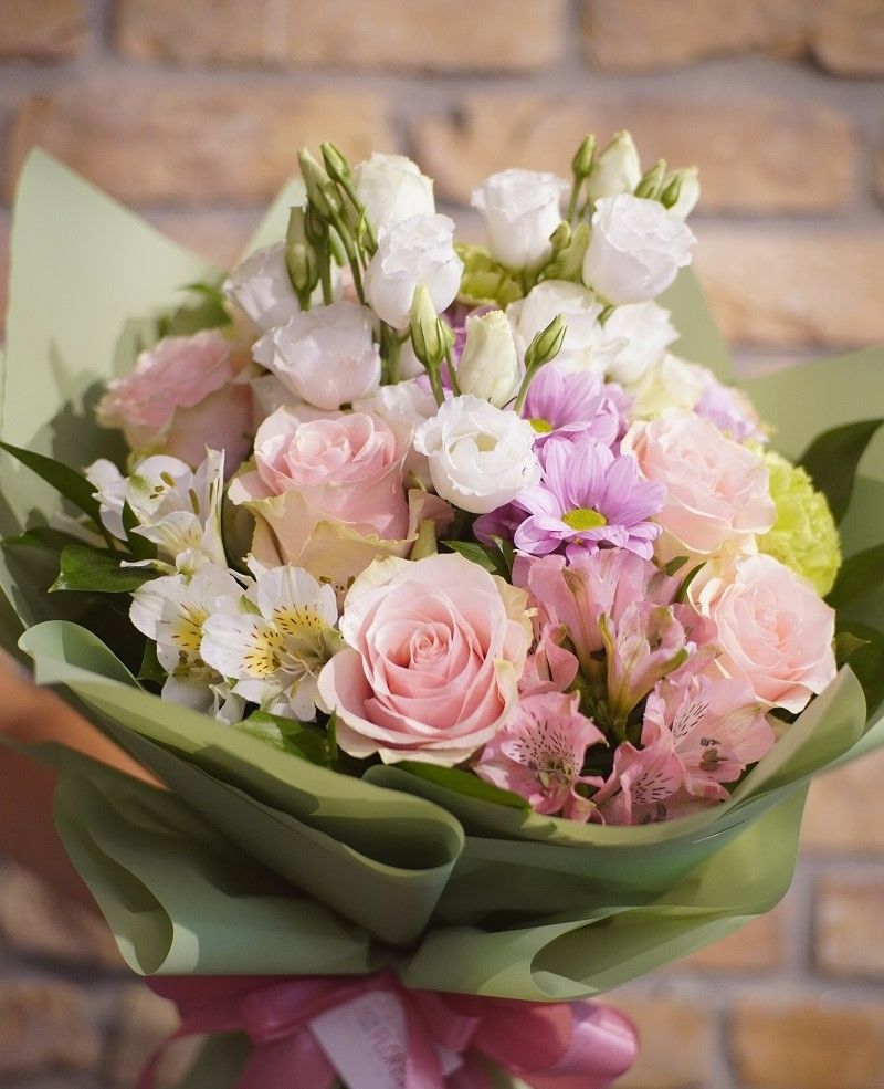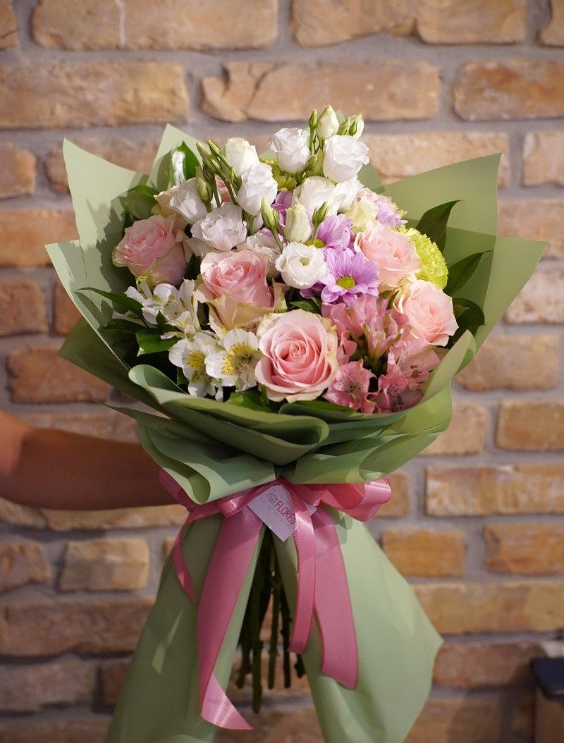Buket u L veličini sadrži miješano cvijeće u odabranoj boji (crvena, roza, bijela, narančasta ili mix).