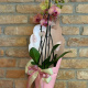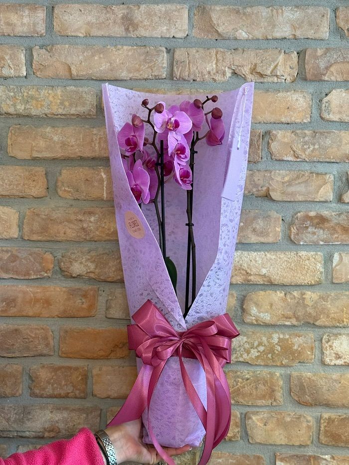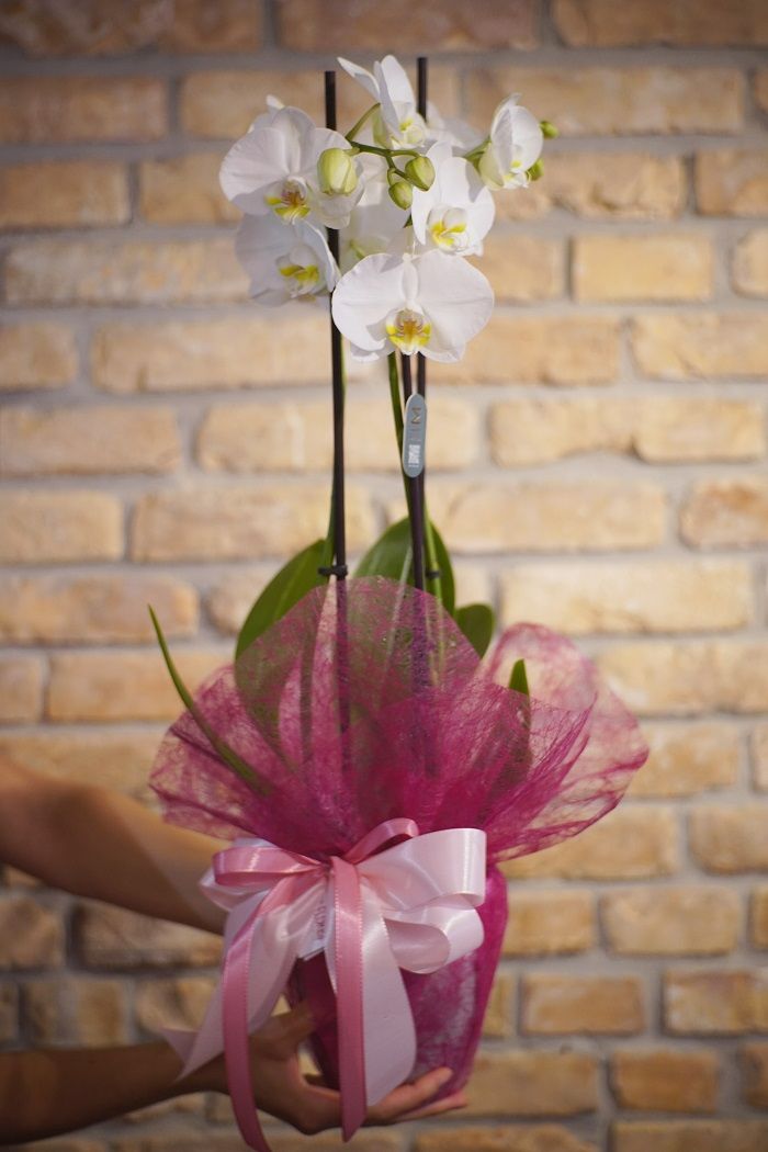 Paket sadrži  Phaleonopsis orhideju sa 2 grane u vazi promjera 12 cm, ukrasnu vazu i dekorativni omot.